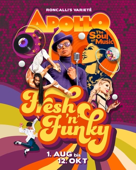 Ab dem 1. August wird es in Roncalli’s Apollo Varieté wieder musikalisch. Mit der neuen Show „Fresh ’n’ Funky – The Soul of Music“ erwartet das Publikum eine mitreißende Hommage an Funk, Soul und R’n’B. Dabei verbindet die neueste Apollo-Produktion kraftvollen Live-Gesang, spektakuläre Artistik und nostalgischen Bühnencharme zu einem unvergesslichen Gesamterlebnis.